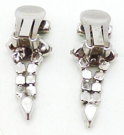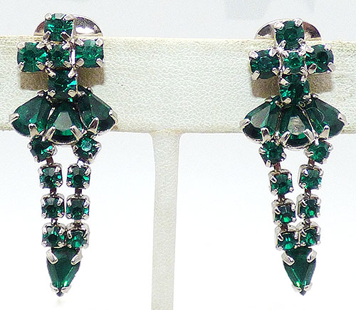 Description: Emerald green rhinestone drop clip earrings; Twi rows of emerald round rhinestone come to a point below a trio of emerald green teardrops and green rhinestone forming a cross at the top. Silver tone prong setting.