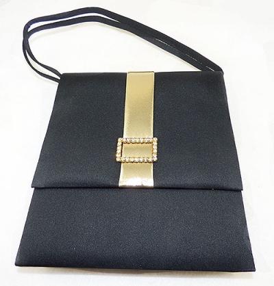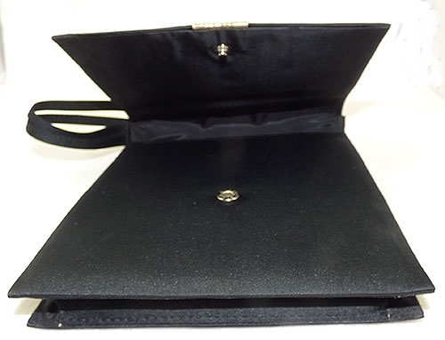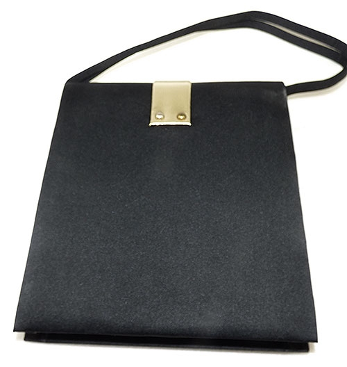 Description: Vintage 1960's black peau de sole evening purse; a large square handbag with a single thick pleat in the bottom. The fold-over flap closure is decorated with a thick, wide gold metallic ribbon and clear rhinestone buckle, it wraps around to the back and is attached with two brass brads and closes in front with a snap. Double strap handle. Shiny black fabric interior with a single pocket along back side. Original 'Made in Hong Kong' sticker still inside.