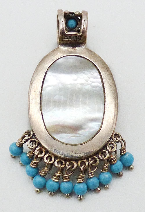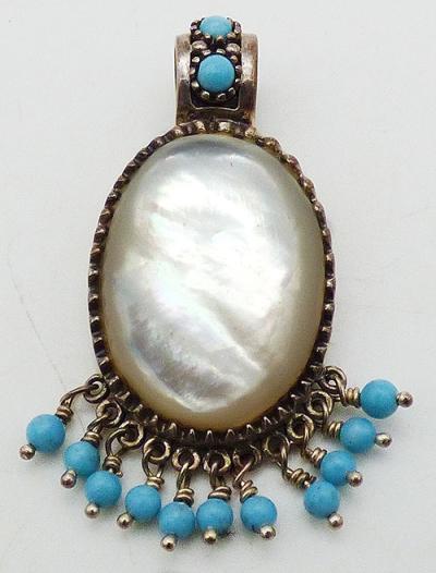 Description: Vintage Thai sterling silver oval pendant set with a large oval mother-of-pearl stone in a serrated edge setting. Eleven small turquoise beads dangle from the bottom edge and two more beads are set into the wide bale. Signed '925 Thai' on the back of the bale.