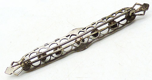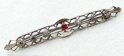 Description: Art Deco period pot metal filigree bar pin with clear and ruby paste stones; a red stone in the center flanked by three clear stones on either side. Simple c-clasp.