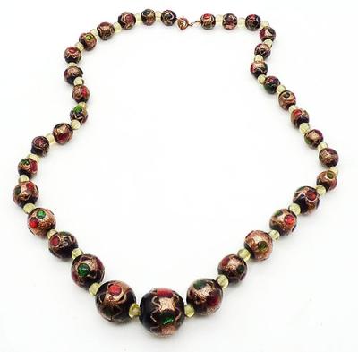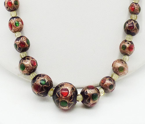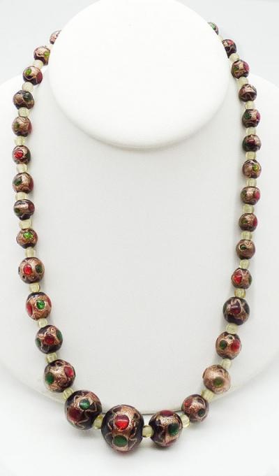 Description: Vintage Murano peacock eye glass beads; a single strand of graduated size beads, the largest is 3/4" in front, smaller is 5/16" at the clasp. The beads are black with red and green foil glass 'eyes' and wedding cake style glittering copper fluss around the centers. Clear and copper fluss with white core spacer beads throughout.