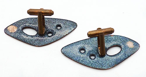 Description: Vintage mid-century modernist enameled copper unusually large cuff links; the abstract oversized design is in red with a slight black splatter pattern over red stripes, bright white dots and a black dot. The copper has cut-outs, a large oval and a pair of small circles, clearer view from the back. Links are brass.