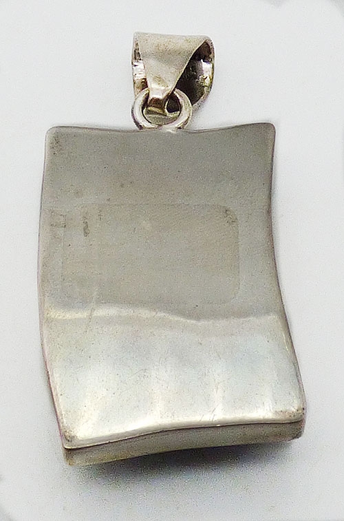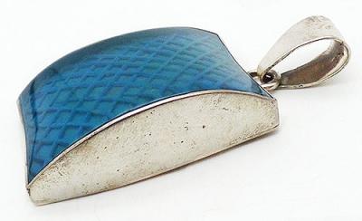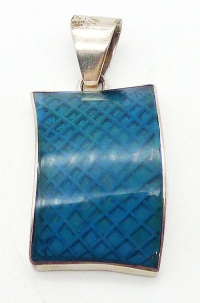 Description: House of Bangles Mexican sterling silver thick curved and domed teal pendant. The teal material has a textured 3-D diagonal cross-hatch pattern and is encased in clear lucite. I can not tell what the inside teal material is - Cloth? Dyed Stone? Lucite? The pendant hangs from a wide sterling bale hallmarked 'Mex' '925' 'HOB' for House of Bangles on the inside.