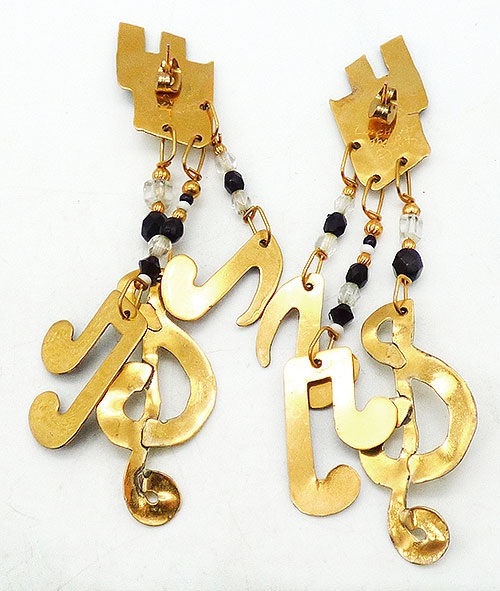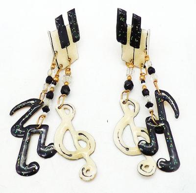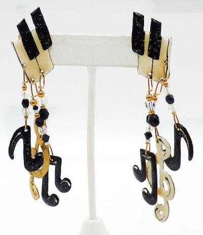 Description: Lunch at the Ritz vintage enameled music theme pierced post earrings; black glitter enamel notes and a cream enamel treble clef dangle from bead strands attached to a pair of piano keys at the top. The keys are cream and black glitter enamel with black detail. Bead strap are a mix of black, white, clear and white beads. Etched 'Lunch at the Ritz ©' on the backs.