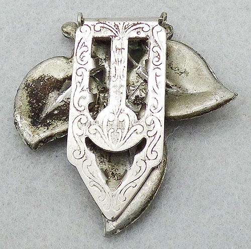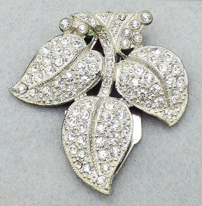Description: Little Nemo vintage Art Deco pot metal clear rhinestone triple leaves dress clip; three cascading leaves on stems pavé set with clear rhinestones. Signed 'L/N' on the back.