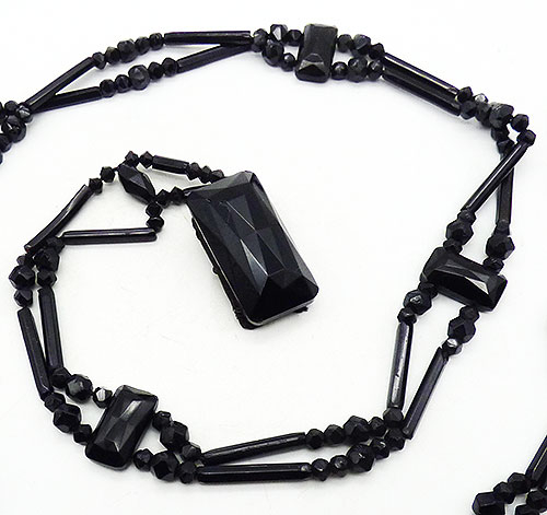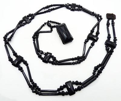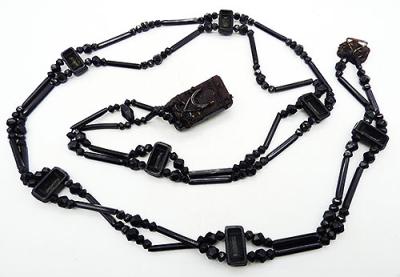 Description: Art Deco period French jet bead flapper belt; double strands of large and small round faceted French jet beads and very long narrow tube beads are strung through rectangular black metal beads set with faceted black glass rectangle stones. The hook and eye closure is sewn under a much larger black glass rectangle on one end and seven onto black fabric on the other.