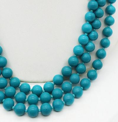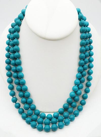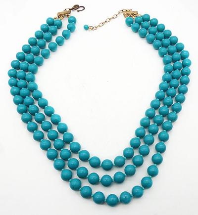 Description: KJL Kenneth Lane Czech opaque turquoise glass beads triple strand necklace; the three strands have small aqua glass spacer beads and are attached to a plain gold tone connector. Gold tone extender chain on one side, larger 'S' hook on the other. Signed '©KJL' (no periods) on one side of a metal hang tag, 'Czech Republic' on the other side.