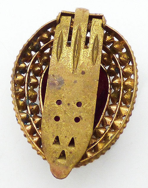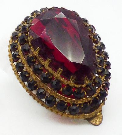 Description: Czech vintage tiered teardrop shaped brass dress clip; a large faceted garnet glass teardrop shaped stone is on top of two stacked tiers lined with garnet rhinestones. The tiers have brass bead decoration between them and all stones are prong set. Attributed to Czechoslovakia.