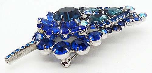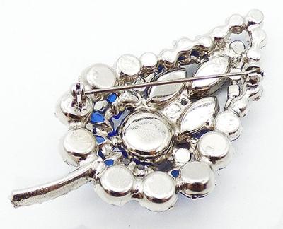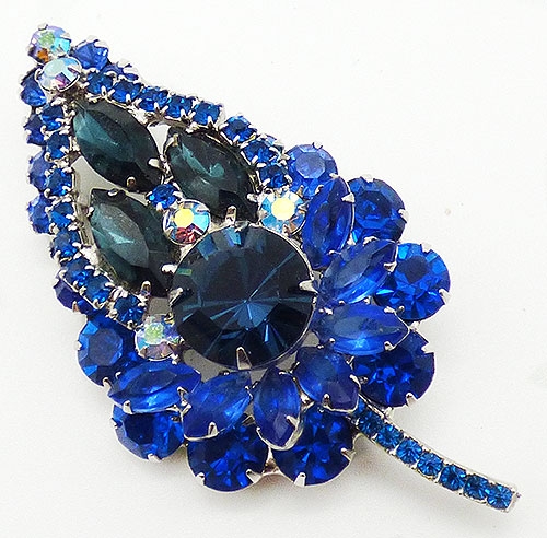 Description: Juliana vintage silver tone shades of blue rhinestones layered leaf brooch; the top layer has a very large Montana blue round rhinestone and a trio of Montana blue navettes. The navettes are outlined with a row of small capri blue rhinestones and a sweep of sapphire blue navettes are along the larger stone with blue aurora rhinestones accenting. The bottom layer has larger sapphire blue rhinestones around the base and the smaller rhinestones outlining the leaf. The stem is set with capri blue rhinestones. Confirmed Juliana, DeLizza and Elster.