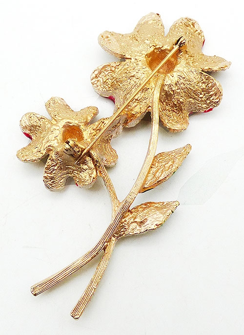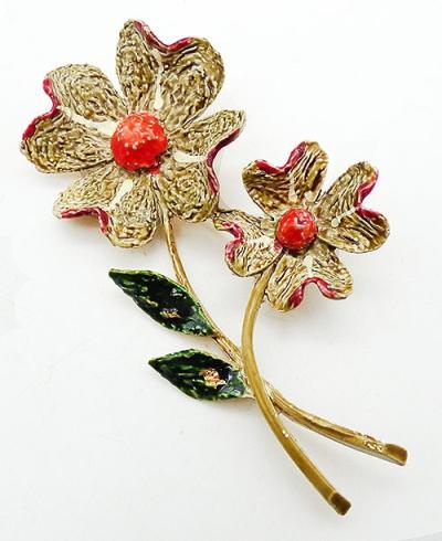 Description: Signed Art tan and orange enamel gold tone double flower brooch; two flowers with heavily textured tan enamel peat, red enamel along the edges and orange enamel centers are on ling olive green stems with dark green textured enamel leaves. Signed 'Art©' on the back.