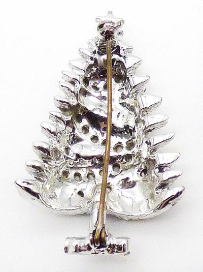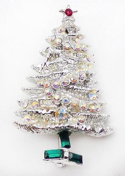 Description: Vintage siłver plated Christmas tree brooch; the three dimensional silver boughs are criss-crossed with crystal aurora borealis rhinestone garland. The trunk and base are set with emerald green baguette rhinestone and a red rhinestone is in the star at the top.
