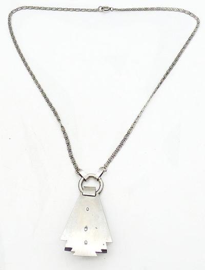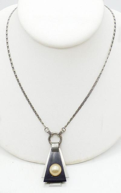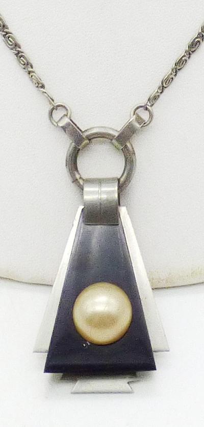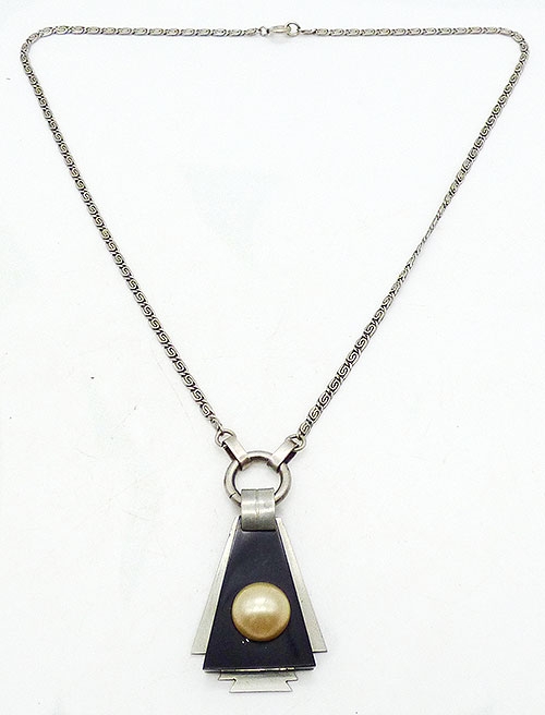 Description: Jakob Bengal German Machine Age chrome and galalith geometric necklace; a black galalith trapezoid is mounted to a larger chrome pendant so the edges are visible. A faux half pearl is set in the center offset towards the bottom The trapezoid swings from a large chrome ring linked to the snail chain. Attribute Jakob Bengal, Germany, early 1930's