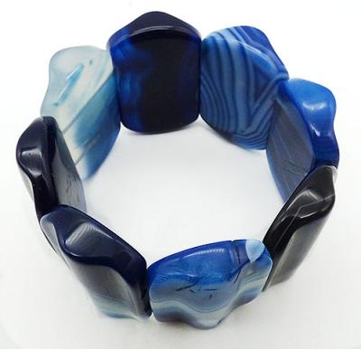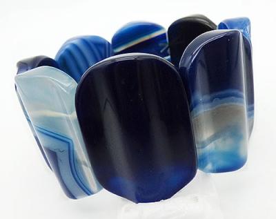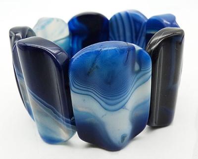 Description: Wide and chunky blue banded agate stretch bracelet; extra large pieces of stone, flat on the inside and convex on the outside of the stones down the middle. Eight stones, all different, ranging from from a super dark navy blue to nearly transparent pale pale blue. Double drilled and strung on two light of elastic nylon.