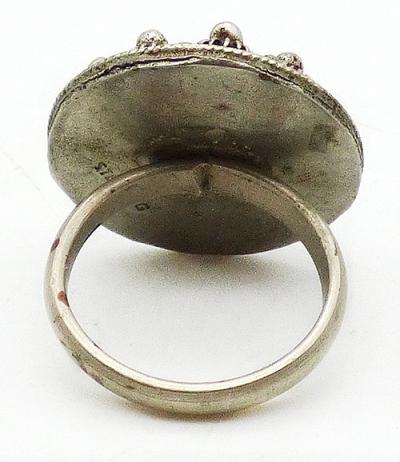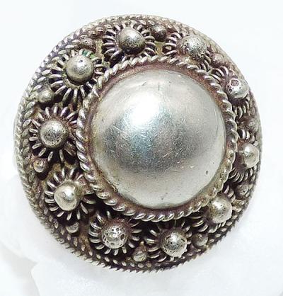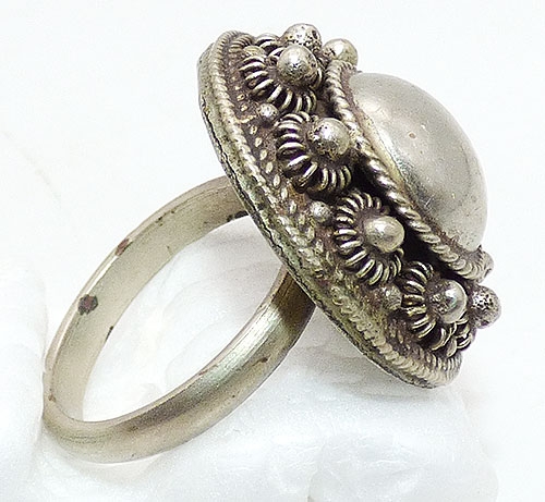 Description: Siam sterling silver vintage domed cannetille ring; the sterling dome in the center is edge with a twisted wire and surrounded by cannetille decoration with a silver wire brass along the outer edge. Signed 'Siam Sterling' on the bottom.