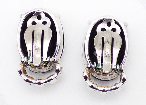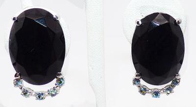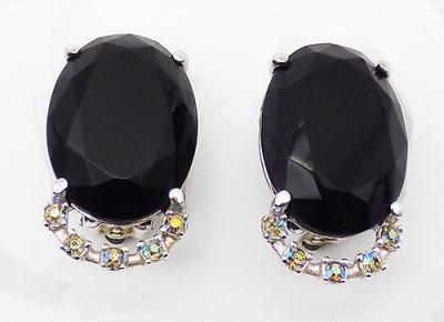 Description: Vintage Schiaparelli silver tone black glass clip earrings; elegant and large faceted opaque black glass oval stones with a semi-circle of dark aurora rhinestone beneath. Signed 'Schiaparelli' on the clips.