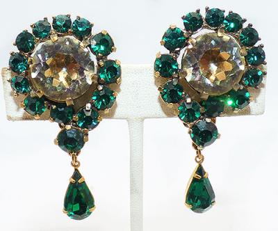 Description: Schiaparelli vintage gold plated emerald green and citrine yellow rhinestone clip earrings; a huge round pale yellow rhinestone center is surrounded by emerald green round rhinestones. An emerald teardrop rhinestone dangles from a slight larger green rhinestone at the bottom. Signed 'Schiaparelli' on the clips.