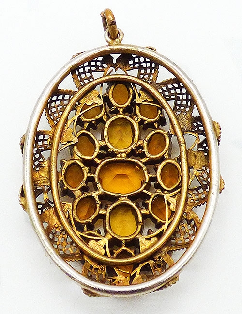 Description: Czech vintage brass filigree and golden topaz rhinestone pendant; a large oval pendant, the inner oval is filled in with three sizes of golden topaz oval rhinestones. The outer frame is decorated with cross-hatch filigree triangles and small stamped brass flowers to the sides. Older spring ring as a bale.