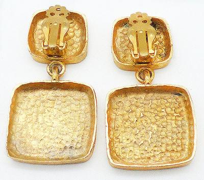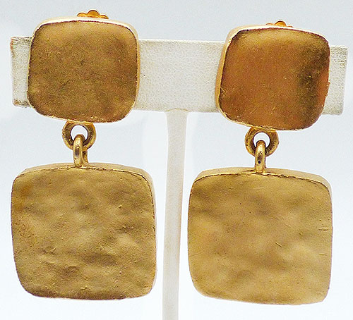 Description: Vintage lightly hammered matte gold plated dangling squares clip earrings, a larger square hangs from a smaller square at the top.